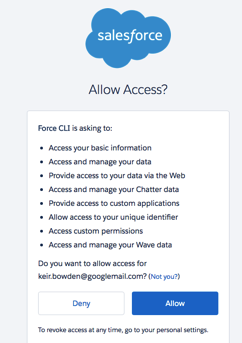 (Note that this process involves a Heroku app communicating with a local web server to return the oauth token to the command line, which may be problematic if you are behind a firewall that you can’t configure or using NAT. See the end of this post for an alternative, non-oauth approach).